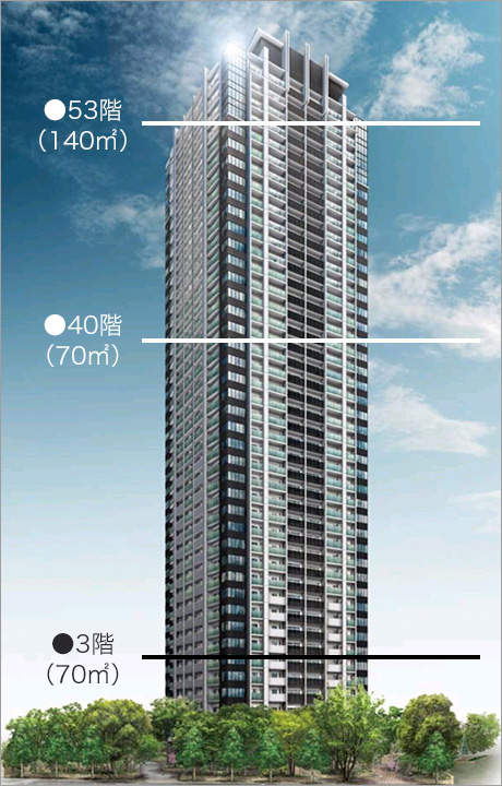 例えば、極端な例になりますが、最上階の南向きと最下層の北向きは同じ面積であっても価格が大きく異なります。1階違うと約1%、南北価格差は通常10%程度あるので、2階の北向きと42階の南向きでは購入価格が約50%違うことになります。2階が4000万円なら、42階は6000万円。